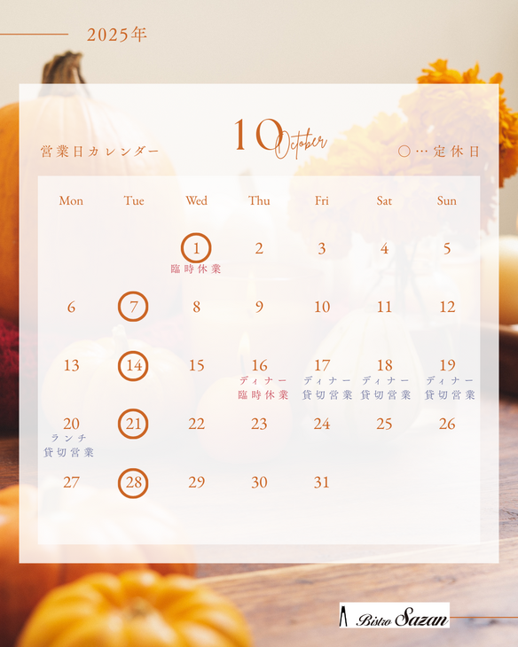 *10月20日(月)のランチタイムは貸切営業とさせていただきます。